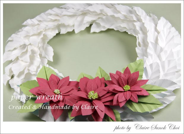14. 13번에서 흰색 띠지를 자르고 남은 종이를 반으로 잘라 느슨한 타원형을 만들어 13번에서 만든 작은 눈 결정체 사이에 붙인다.